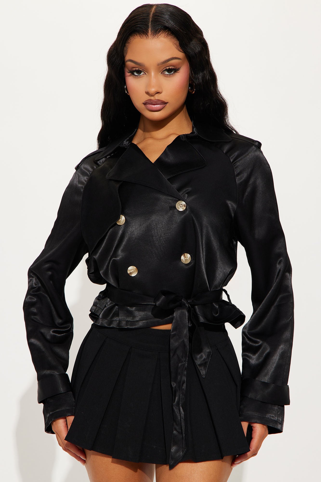 Featuring a chic cropped design, this black satin cropped trench coat adds a modern twist to a timeless style. It's equipped with a double-breasted front and stylish buttons that give it a polished look. The adjustable tie waist allows you to customize the fit, creating a flattering shape that highlights your waist.