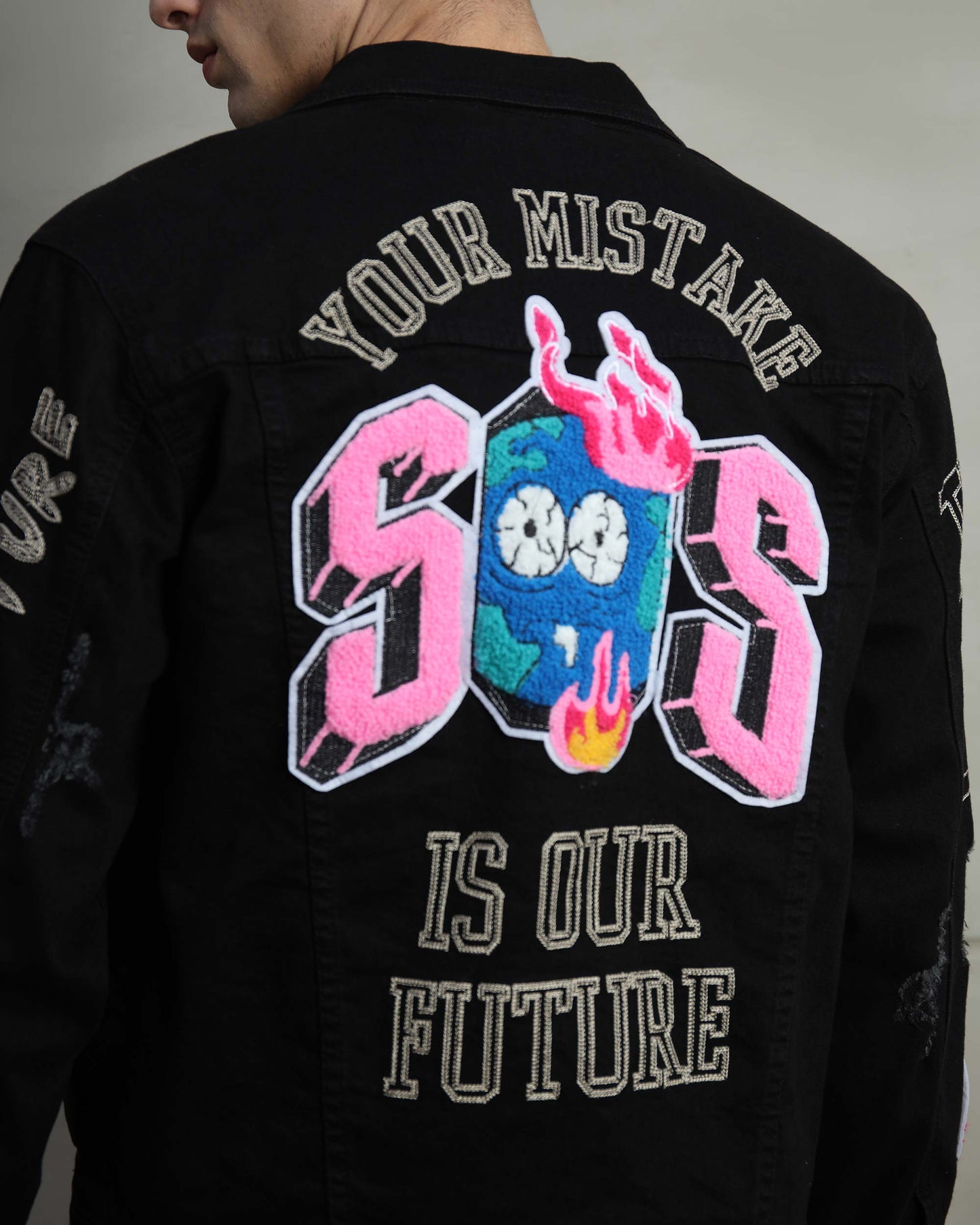 Ripped Black Denim Jacket with Embroidery and graffiti